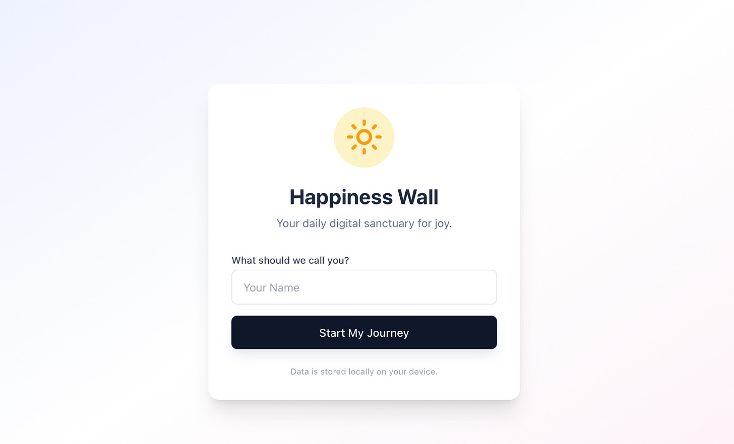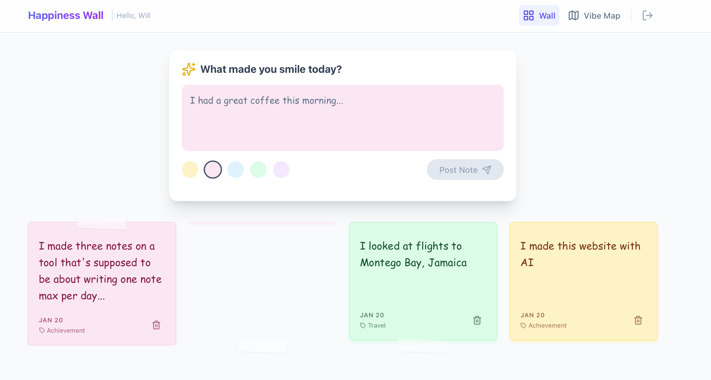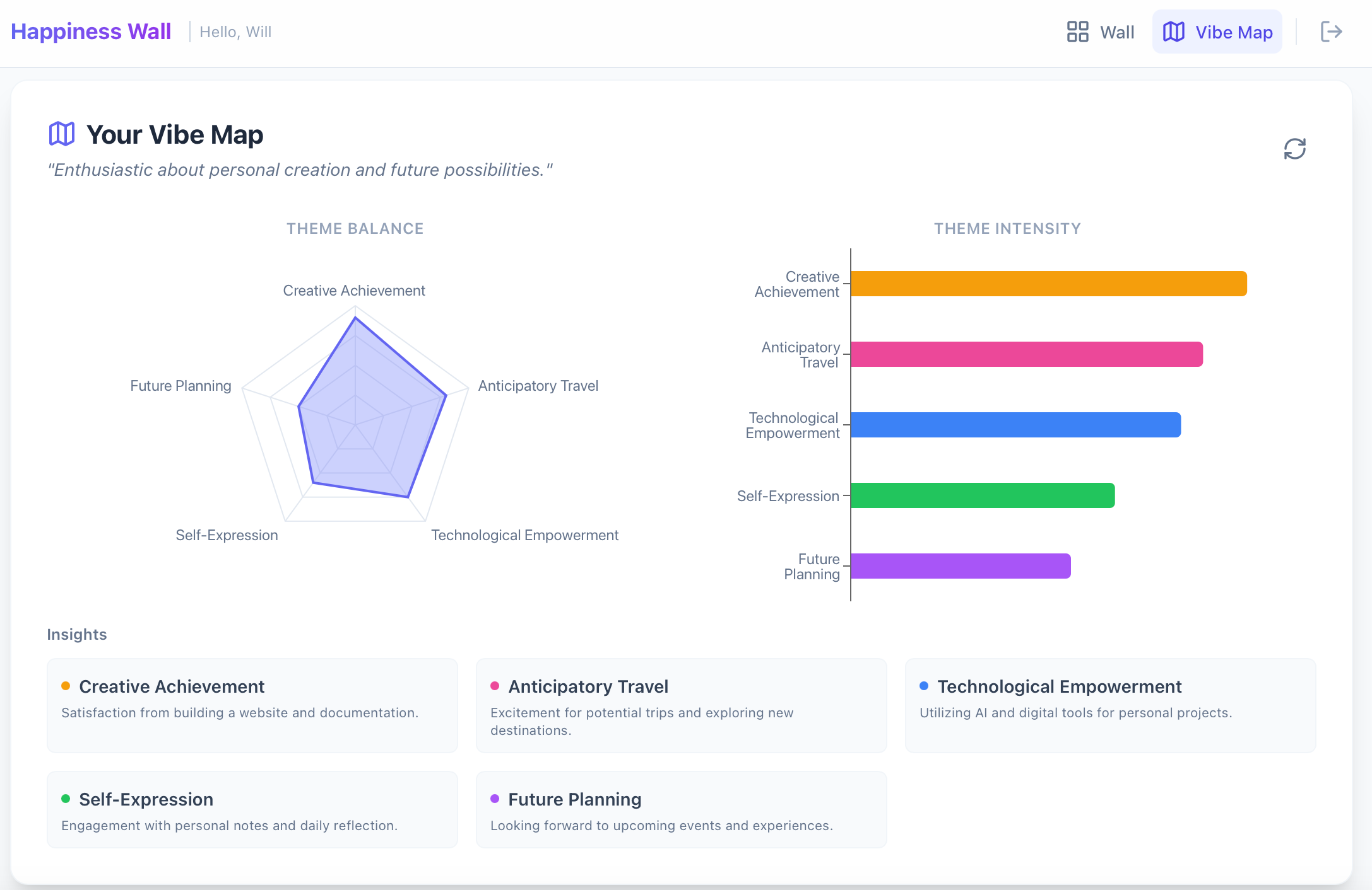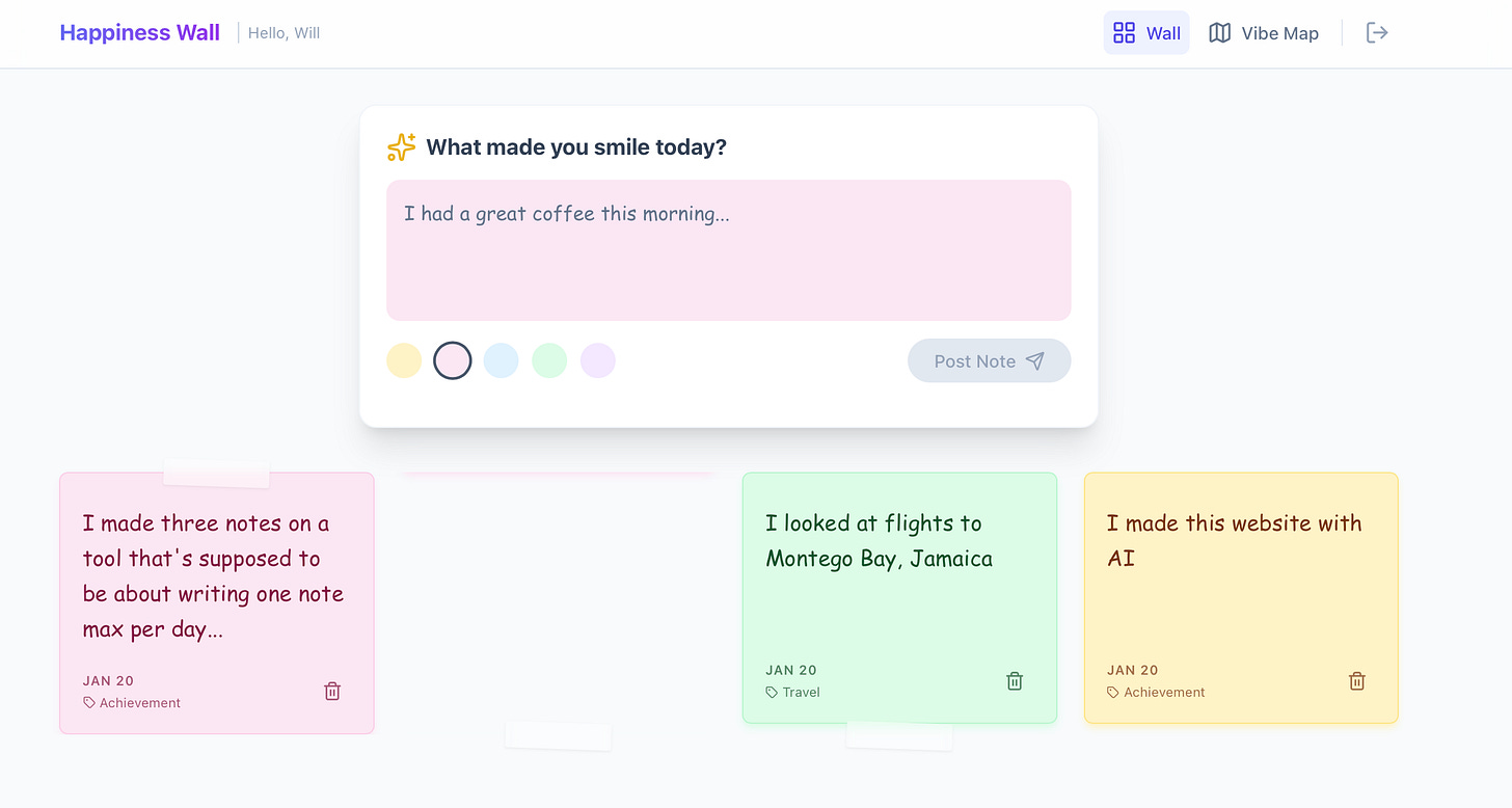 I’ll show this through an app I am currently vibe coding that lets a user enter a word or phrase to encapsulate their day based on Etymology Nerd’s happiness wall effort.